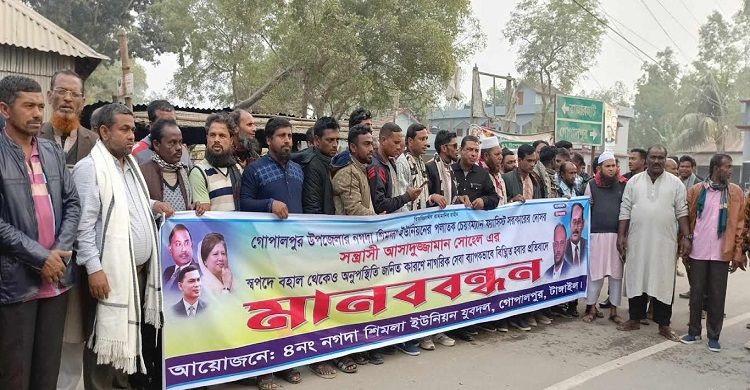 গোপালপুর প্রতিনিধিঃ টাংগাইলের গোপালপুর উপজেলার ৪নং নগদা শিমলা ইউনিয়নের চেয়ারম্যান আসাদুজ্জামান সোহেল ''৫ ই' আগস্ট সরকার পতনের পর থেকে স্বপদে বহাল থেকেও অনুপস্থিত জনিত কারণে নাগরিক সেবা ব্যাপকভাবে বিঘ্নত হওয়ার প্রতিবাদে শিমলা ইউনিয়ন যুবদল ব্যানারে এ মানববন্ধন অনুষ্ঠিত হয়।