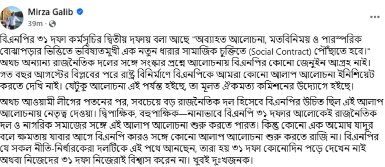 নিউজ ডেস্কঃ ঢাকা বিশ্ববিদ্যালয় শাখা ছাত্রশিবিরের সাবেক সভাপতি ও যুক্তরাষ্ট্রের হাওয়ার্ড বিশ্ববিদ্যালয়ের সহকারী অধ্যাপক ড. মির্জা গালিব তার ভেরিফায়েড ফেসবুক আইডিতে এক পোস্টে বলেছেন, বিএনপির ৩১ দফা কর্মসূচির দ্বিতীয় দফায় বলা হয়েছে ‘অব্যাহত আলোচনা, মতবিনিময় ও পারস্পরিক বোঝাপড়ার ভিত্তিতে ভবিষ্যতমুখী এক নতুন ধারার সামাজিক চুক্তিতে (সোশ্যাল কনট্রাক্ট) পৌঁছাতে হবে’।
