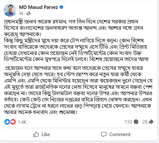 বিনোদন ডেস্ক : কিছু মন্ত্রীর মুখে টেপ লাগিয়ে দেওয়া দরকার বলে মনে করেন চিত্রনায়ক সোহেল রানা। ফেসবুক পোস্টে অভিনেতা বলছেন, প্রধানমন্ত্রী তারেক রহমান, গত তিন দিনে দেশের সরকার প্রধান হিসেবে বাংলাদেশের জনসাধারণ অত্যন্ত আনন্দ এবং আশার সঙ্গে গ্রহণ করেছে আপনাকে। কিন্তু কিছু মন্ত্রীকে মুখে দয়া করে টেপ লাগিয়ে দিতে বলুন।