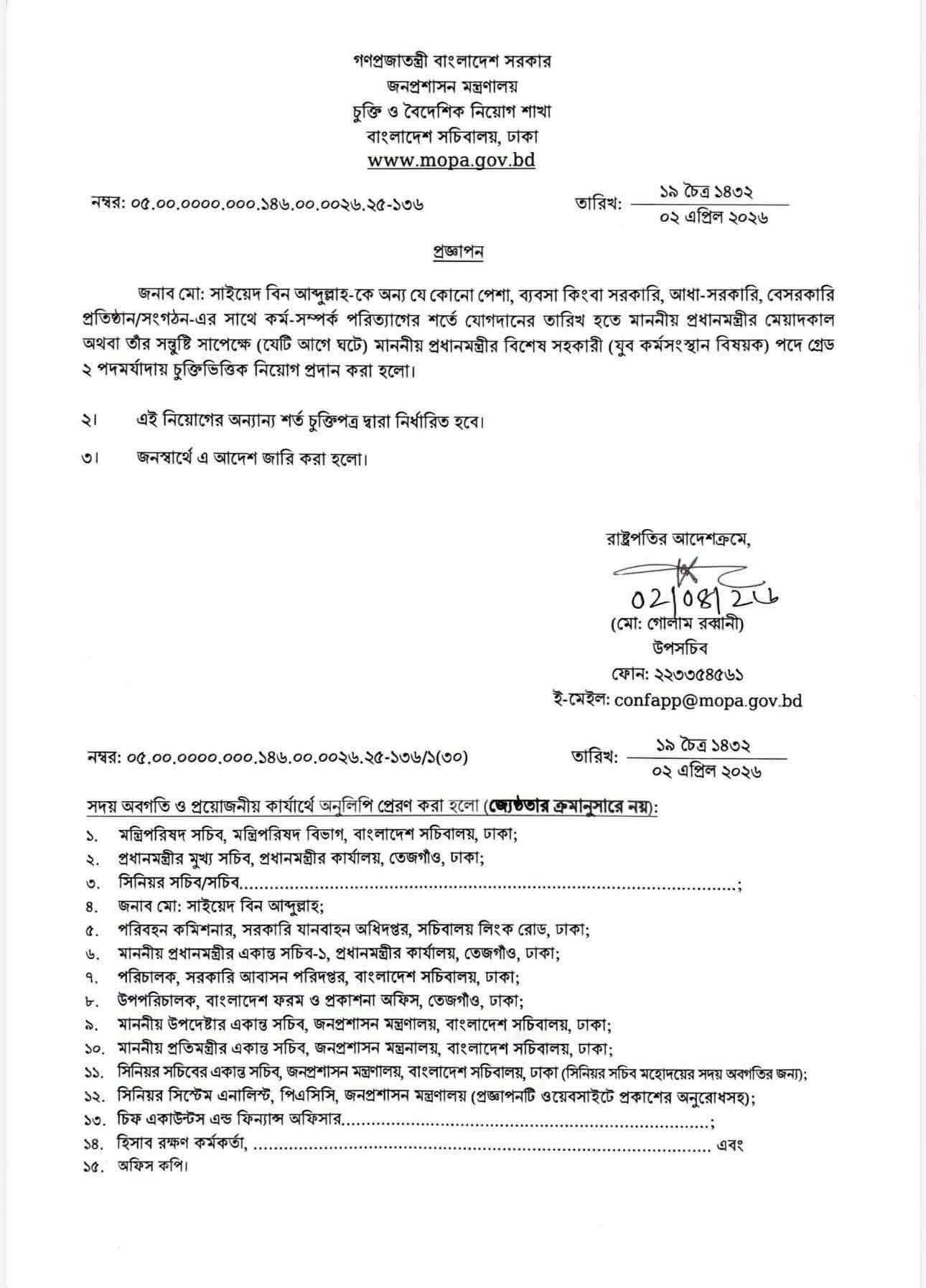 বৃহস্পতিবার (২ এপ্রিল) জনপ্রশাসন মন্ত্রণালয়ের চুক্তি ও বৈদেশিক নিয়োগ শাখা থেকে এ বিষয়ে প্রজ্ঞাপন জারি করা হয়েছে।
