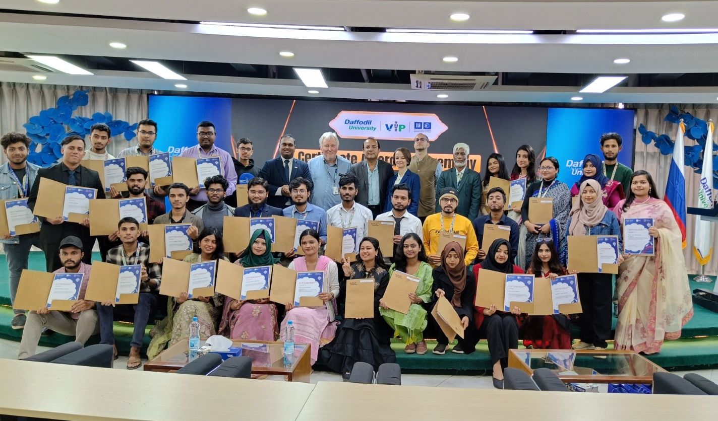 Diplomatic Correspondent: Daffodil International University (DIU) hosted a Certificate Awarding Ceremony on 9 December 2025 for the participants of the Russian Language Short Course. The course was conducted from 6 October to 25 November 2025 by a professor from Saint Petersburg State University, with a total of 48 participants successfully completing the program.