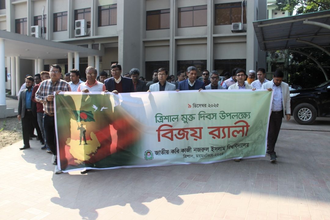 Mymensingh Correspondent: Trishal Free Day was celebrated with due respect at Jatiya Kabi Kazi Nazrul Islam University. On Tuesday (December 9, 2025) morning, the Honourable Vice-Chancellor of the university, Professor Dr. Md. Jahangir Alam, hoisted the national flag with the national anthem in front of the new administrative building. After hoisting the flag, a Victory Rally paraded the various roads of the university and ended at the 'Chiro Unnot Momo Shir' monument. There, wreaths were laid on behalf of the university family to pay deep respect to the martyrs who sacrificed their lives in the Liberation War. A brief discussion meeting was held after the tribute. In his speech as the Chief Guest at the discussion meeting, Vice-Chancellor Professor Dr. Md. Jahangir Alam said, "We remember with deep respect the freedom fighters who gave their lives, their wealth, and made various sacrifices, and we pray for the salvation of their departed souls. Although we may not feel the excitement and emotion with the same intensity with which the residents of Trishal experienced this day on December 9, 1971, we hold it in our consciousness. It is from this time in December that we began to regain our lost power. In 1971, Bengalis were united for the first time. The struggle to end political, administrative, and economic deprivation began on this day, culminating in the final victory on December 16. We wish that by holding onto the spirit of Trishal Free Day and Victory Day, we may continue to live freely as true Bangladeshis in the future.” Treasurer Professor Dr. Zainul Abedin Siddique, Dean of the Faculty of Arts Professor Dr. Mohammad Imdadul Huda, and Dean of the Faculty of Science and Engineering and Convener of the Trishal Free Day, Martyred Intellectuals, and Great Victory Day Celebration Committee Professor Dr. A H M Kamal also spoke at the meeting. Also present at the event were Dean of the Faculty of Business Administration Professor Dr. Sakhawat Hossain Sarkar, Dean of the Faculty of Fine Arts and Member-Secretary of the Celebration Committee Professor Dr. Muhammad Emdadur Rashed (Rashed Sukhon), Dean of the Faculty of Law Muhammad Irfan Aziz, Registrar (Acting) Professor Dr. Md. Mizanur Rahman, Proctor Dr. Md. Mahbubur Rahman, Director of the Students' Welfare and Guidance Office Dr. Md. Ashraful Alam, along with teachers, officials, employees, and students.