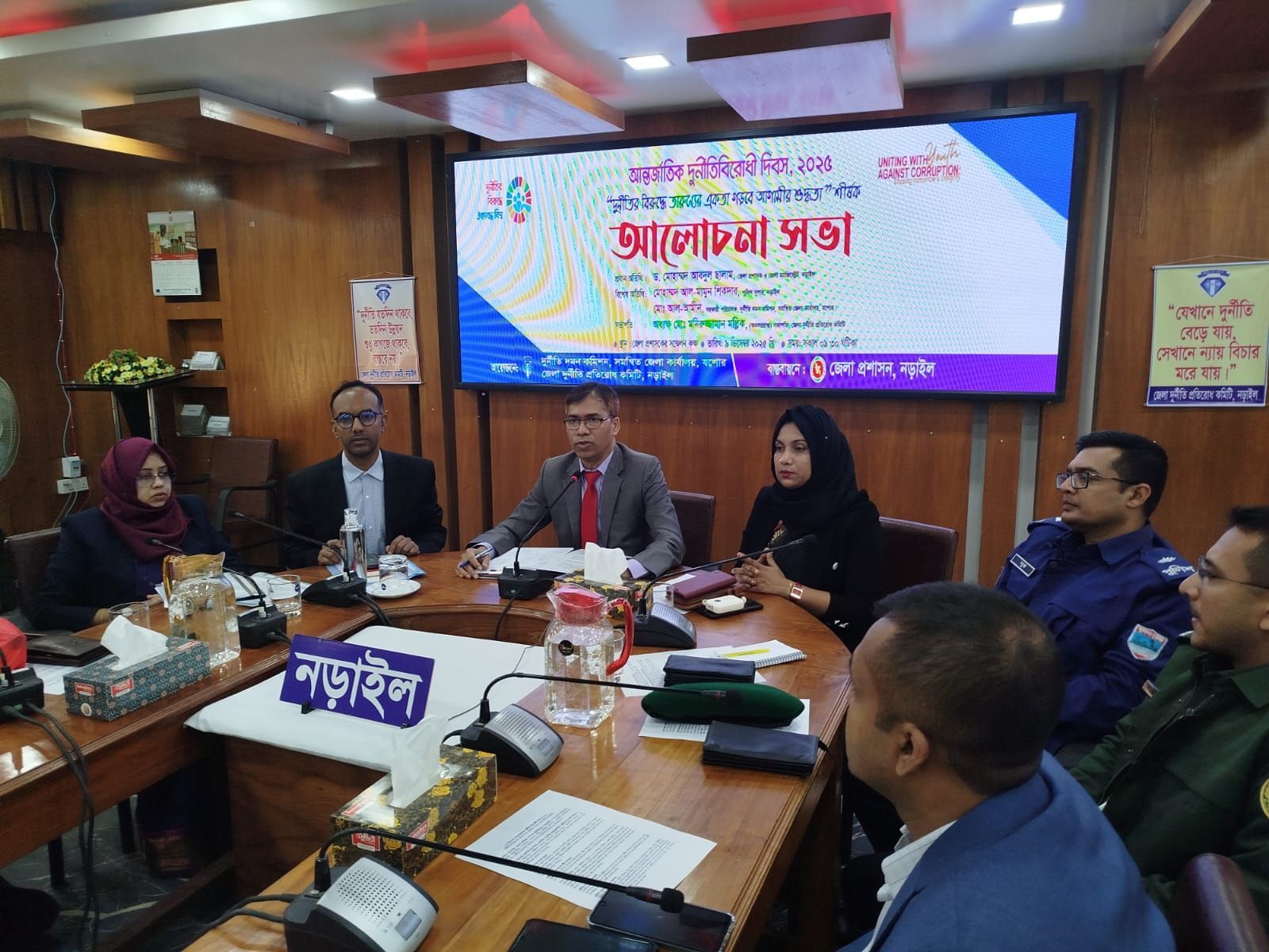 Narail Correspondent: International Anti-Corruption Day was celebrated in Narail with the theme, 'Youth unity against corruption will build future integrity.' A rally and discussion meeting were held on Tuesday morning to observe the day. The day was inaugurated at 9:30 AM in the premises of the Deputy Commissioner's office with the singing of the national anthem and the hoisting of the national flag and the ACC flag, organized by the Anti-Corruption Commission Integrated Jashore District Office and the Narail District Corruption Prevention Committee, in collaboration with the Narail District Administration. Subsequently, a colorful rally paraded the main roads. After the rally, Deputy Commissioner Dr. Mohammad Abdul Salam addressed the discussion meeting held in the DC's conference room as the Chief Guest. The meeting, presided over by the President of the District Corruption Prevention Committee (DPC), Principal (Retd.) Md. Moniruzzaman Mollick, was also addressed by Additional Deputy Commissioner (General) Linkon Biswas, Additional Superintendent of Police Nur-E-Alam Siddique, Assistant Director of the ACC Integrated District Office Md. Al-Amin, Vice-President of Narail Press Club Sultan Mahmud, and President of the District Puja Udjapan Front Ashok Kundu. Additional Deputy Commissioner (Education and ICT) Sarmina Sattar, Additional District Magistrate Hosne Ara Tanny, Narail Sadar Upazila Nirbahi Officer T.M. Rahsin Kabir, LGED Executive Engineer Sardar Ikramul Kabir, Principal of Narail Technical Training Center Abul Bashar Al Mamun, District Information Officer Md. Rostam Ali, District Adjutant of Ansar and VDP Md. Nurul Absar, and others were present at the event, which was anchored by the General Secretary of the District DPC, Kazi Hafizur Rahman. At the end of the discussion meeting, the President of the District DPC, Principal (Retd.) Md. Moniruzzaman Mollick, administered the anti-corruption oath. All those present in the discussion meeting firmly resolved not to engage in corruption and to prevent it from society.