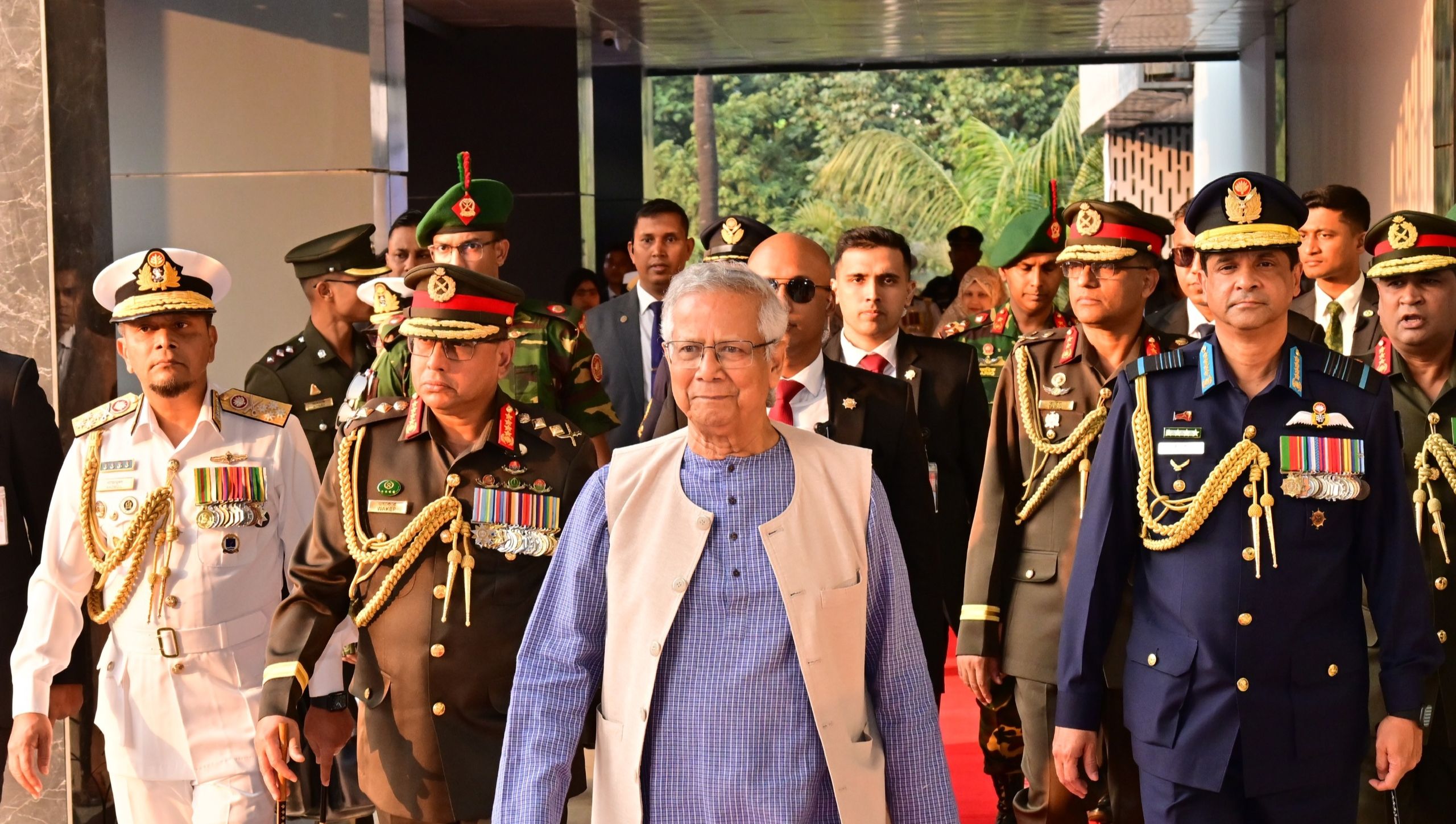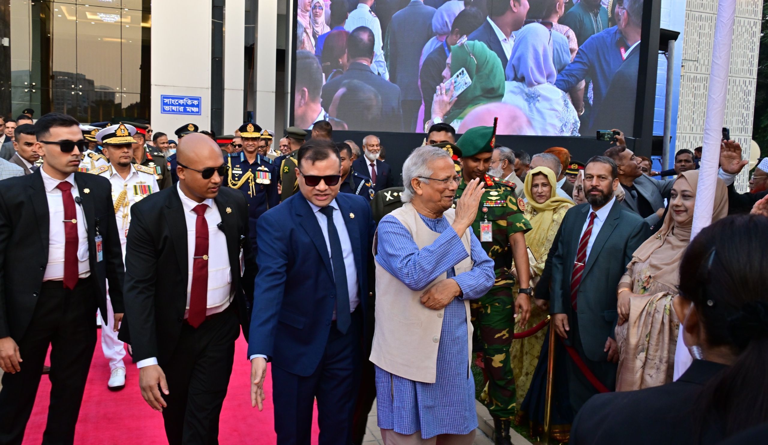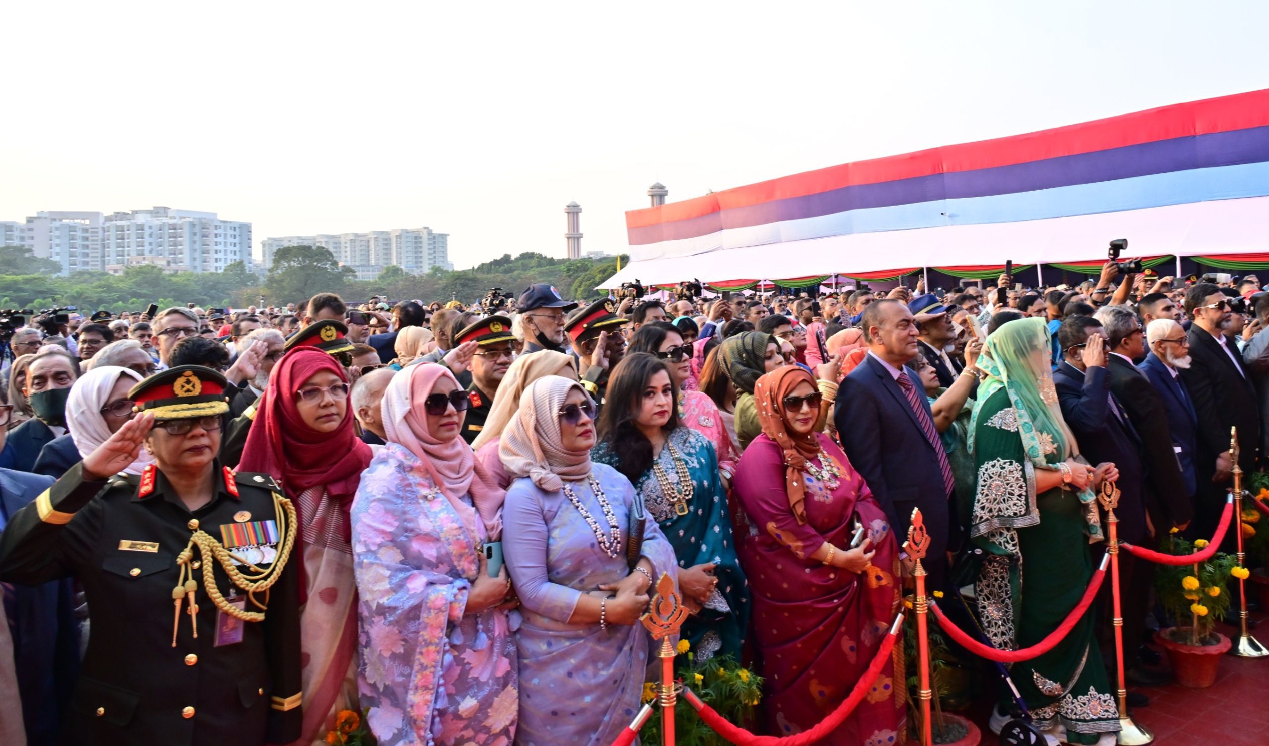 এর আগে মহামান্য রাষ্ট্রপতি এবং মাননীয় প্রধান উপদেষ্টা শিখা অনির্বাণে এসে পৌঁছালে তিন বাহিনী প্রধানগণ এবং সশস্ত্র বাহিনী বিভাগের প্রিন্সিপাল স্টাফ অফিসার তাঁদেরকে স্বাগত জানান ।